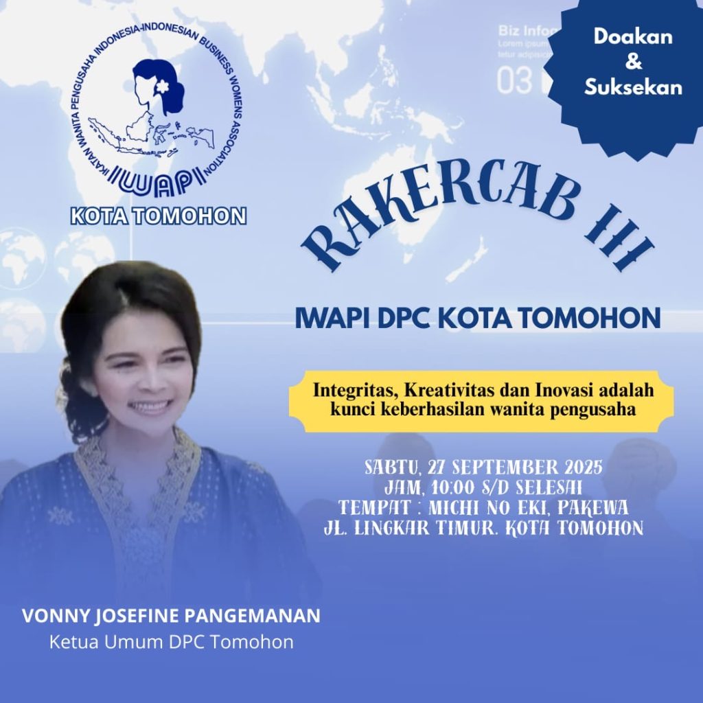 TOMOHON, LensaUtara.id — Rapat Kerja Cabang (Rakercab) Ikatan Wanita Pengusaha Indonesia (IWAPI) Kota Tomohon yang ketiga, digelar Sabtu, (27/9) di Michino No Eki Pakewa, Talete Dua, Tomohon Tengah.