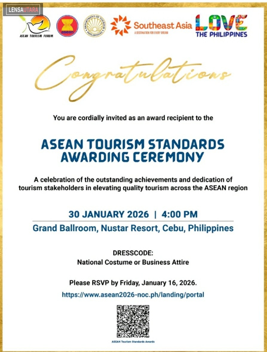 “Department of Tourism of the Republic of the Philippines baru saja memberikan informasi kepada pemerintah Kota Tomohon mengenai Invitation to ASEAN Tourism Standards Awarding Ceremony yang akan dilaksanakan pada tanggal 30 Januari 2026 di Grand Ballroom, Nustar Resort, Cebu, Philippines,” ujar Kadis Pariwisata Kota Tomohon Judhistira Siwu.