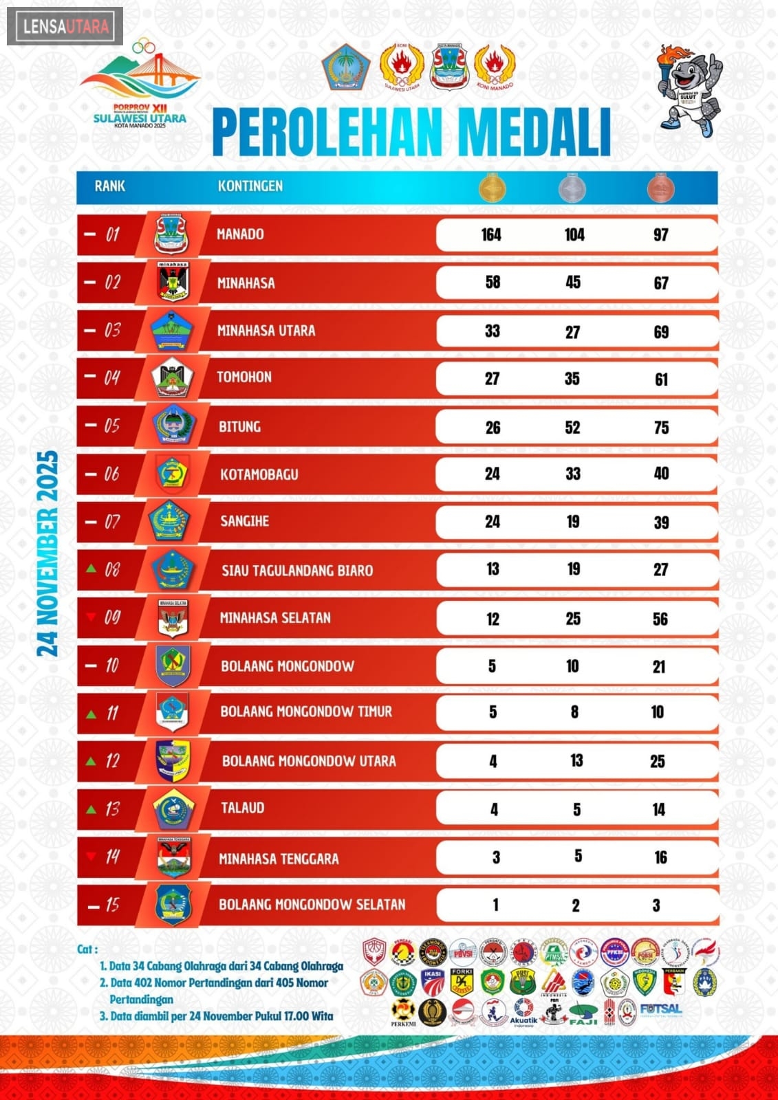 Keberhasilan yang dibawa pulang kontingen Kota Tomohon dari 29 cabang olahraga yang diikuti ini, menempatkan Tomohon di urutan 4 pada klasmen perolehan medali.