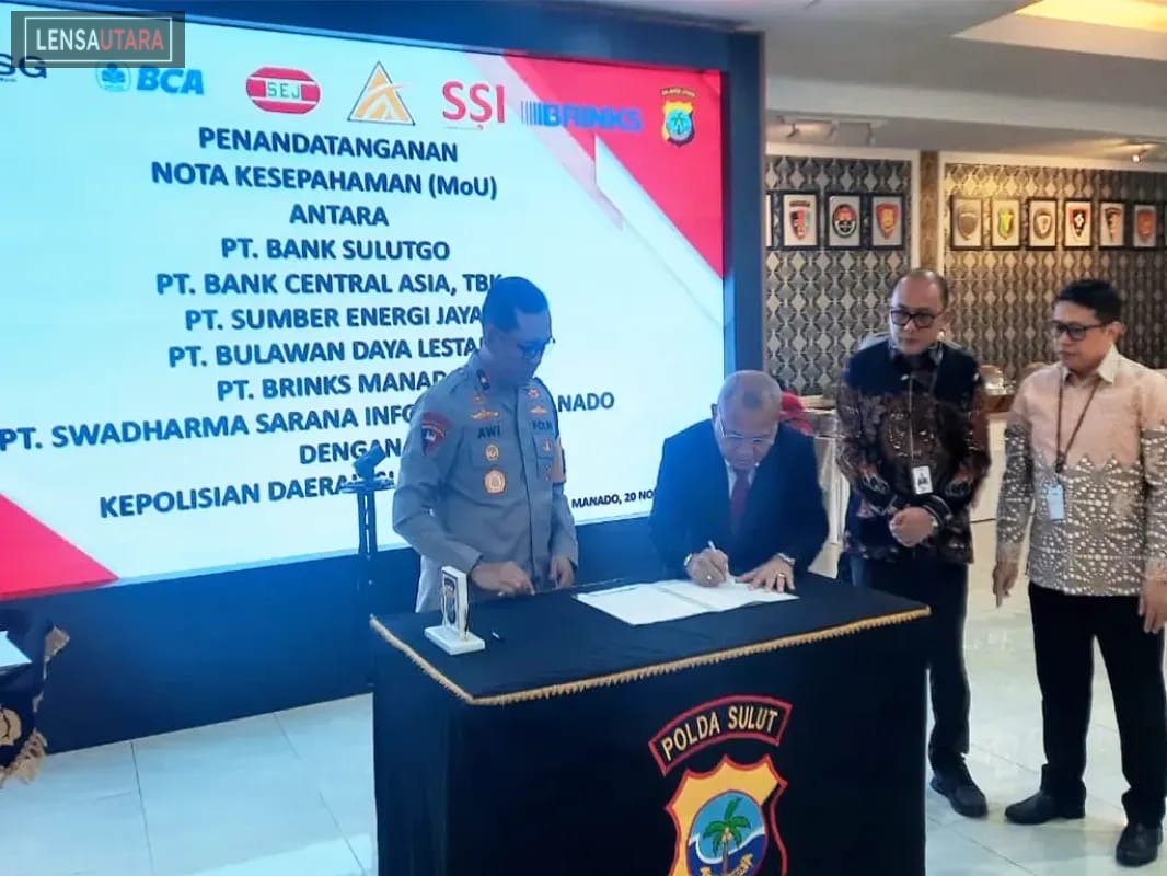 Manado, LensaUtara.id – Guna meningkatkan pengamanan dan pemanfaatan layanan perbankan, Kepolisian Daerah (Polda) Sulawesi Utara menjalin kemitraan strategis dengan PT. Bank Pembangunan Daerah Sulawesi Utara (Bank SulutGo). Kerja sama ini secara resmi dituangkan dalam penandatanganan Nota Kesepahaman (MoU) yang berlangsung di Aula Polda Sulawesi Utara, pada Kamis (20/11/2025) lalu.